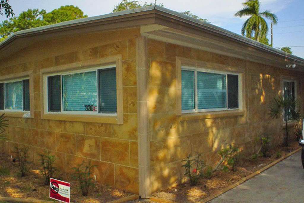 The existing exterior siding on this home was T-111, second only to plywood as the cheapest building material used in the construction industry. The GorgeouStone panels were adhered directly onto the T-111 to give a maintenance free 'facelift' that can be guaranteed for 30 years!